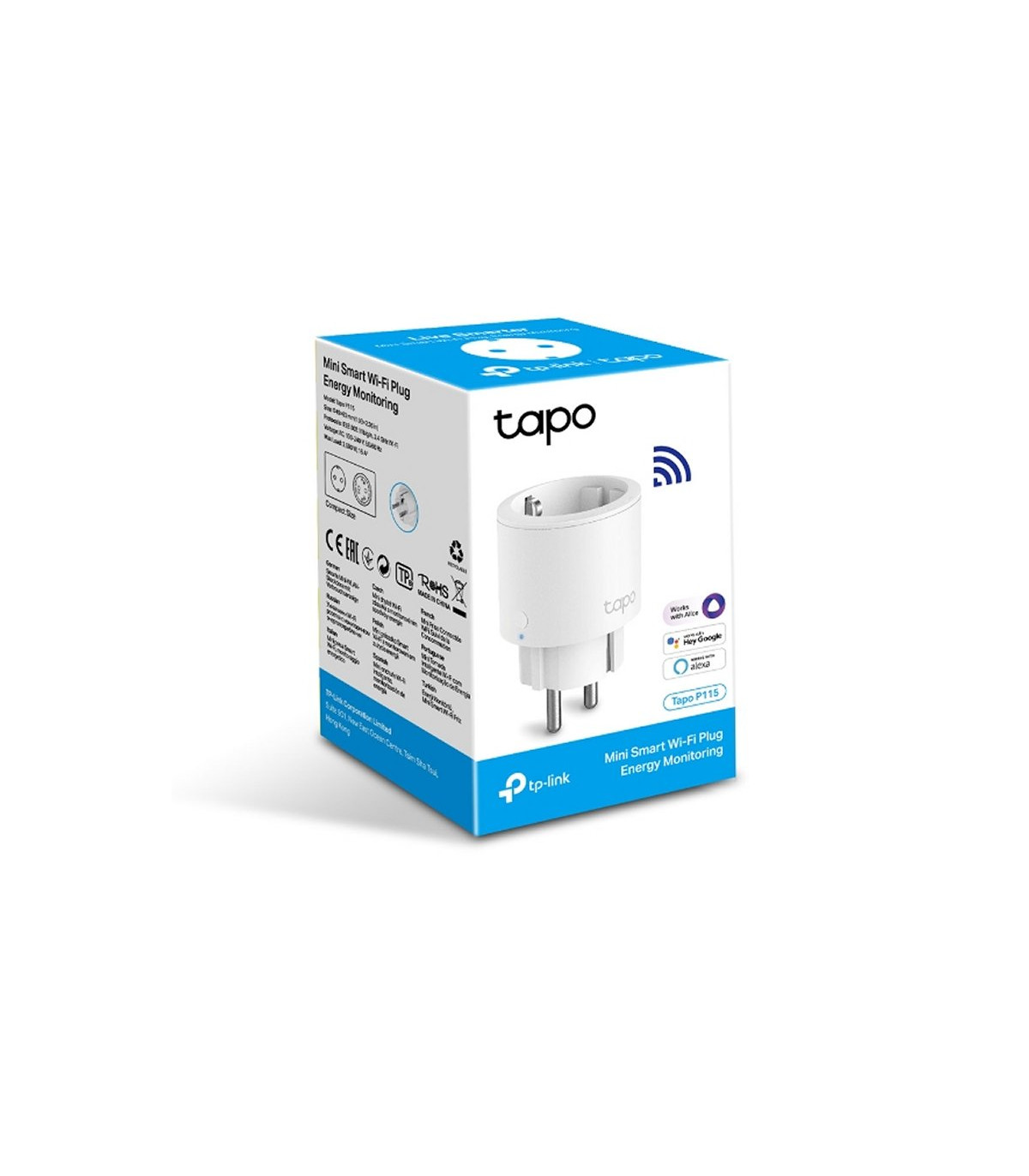 | Otras Características | - Energía: CA 220-240 V~50/60 Hz - Carga máxima: 3680W, 16A - Dimensiones (alto x ancho x profundidad): 49 x 49 x 60mm - Botones: Botón de encendido LED de estado - Certificación: CE RoHS - Temperatura de funcionamiento: 0 ºC–35 ºC - Humedad de funcionamiento: 10%–90%HR, sin condensación Contenidos del paquete: - Tapo P115 - Guía de inicio rápido |