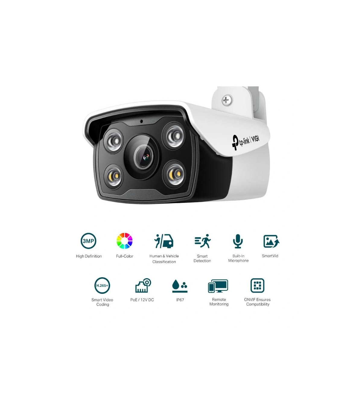 | Características | Red - Protocolo: TCP/IP, UDP, ICMP, HTTP, HTTPS, DHCP, DNS, RTSP, NTP, UPnP UDP, SSL/TLS - ONVIF - API: Interfaz de vídeo en red abierta (perfil S) - Vista en vivo simultánea 3 flujos principales y 3 flujos secundarios - Client: VIGI App, VIGI Security Manager, VIGI NVR, Web - Nube - Seguridad: Protección con contraseña, cifrado HTTPS, filtro de dirección IP, autenticación implícita - Almacenamiento en red: NAS (NFS, SMB/ CIFS) Alarma y Gestión de Eventos - Evento inteligente Clasificación de personas y vehículos Detección de intrusión de área Detección de cruce de líneas Detección de personas Detección de vehículos Detección de entrada de región Detección de salida de región Detección de objetos abandonados Detección de eliminación de objetos - Evento Básico Detección de movimiento Detección de manipulación de vídeo Excepción (inicio de sesión ilegal) - Notificación de salida: Mensaje push - Enlace de alarma: Luz blanca intermitente, mensaje push Alimentación - Consumo energético: Máximo: 5.4 W Típico (Modo Día): 1.93 W Típico (Modo Noche con LED IR): 2,84 W Típico (Modo Noche con LED Blanco): 4.35 W - Fuente de alimentación: 12V CC ± 5%, clavija de alimentación coaxial de 5,5 mm PoE (802.3af/at, clase 0) Dimensiones y peso - 174 × 78 × 71 mm - 0.26 g Contiene - Cámara de red VIGI - Guía de inicio rápido - Accesorios para cables impermeables - Accesorios de montaje |