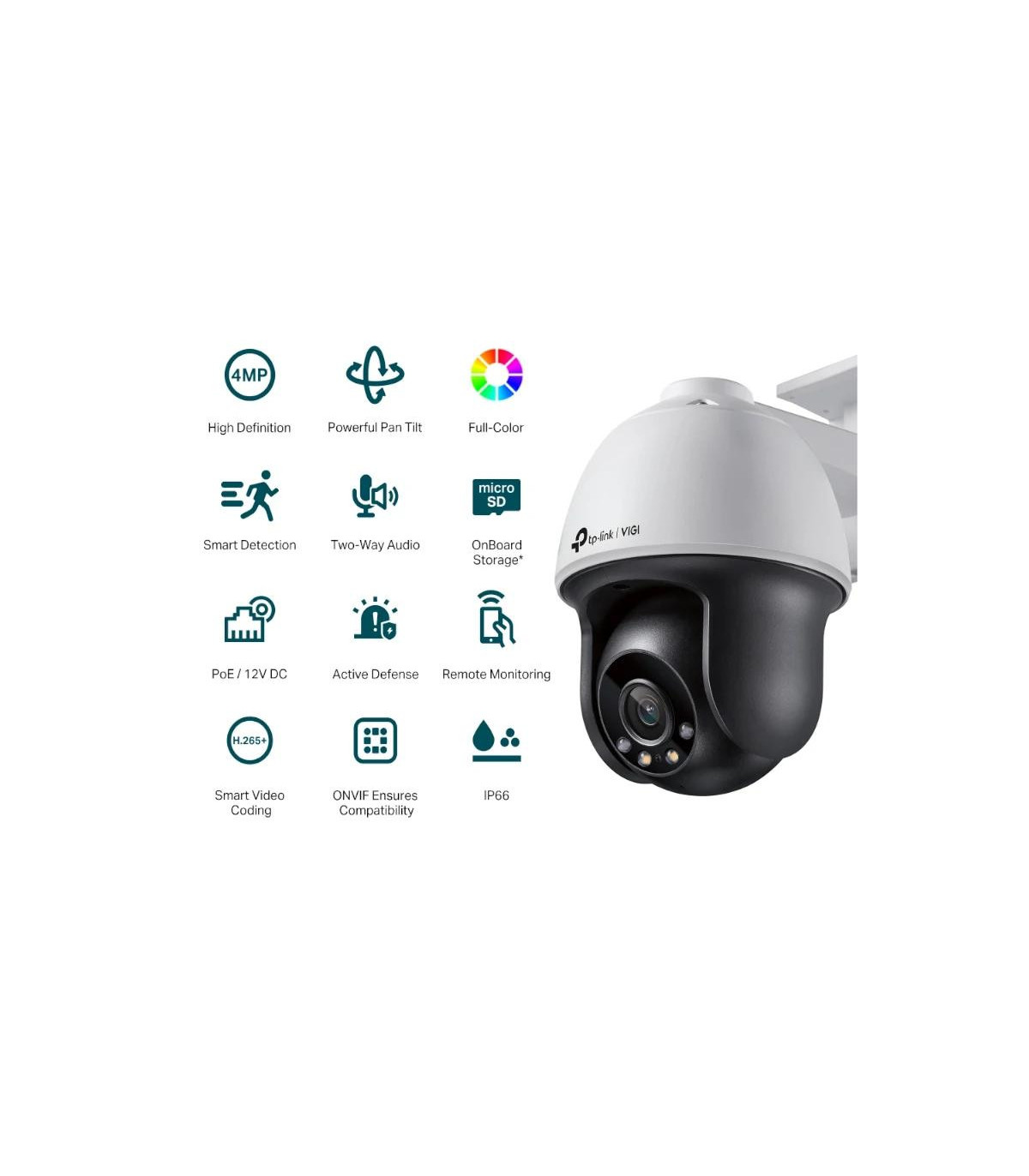 | Interfaces | - Interfaz de Red: 1 x Puerto Ethernet RJ45 10/100M Autoadaptativo - Entrada de Audio: Micrófono incorporado - Salida de Audio: Altavoz integrado - Botón de reinicio - Alimentación: Puerto de alimentación DC - Almacenamiento interno: Ranura para tarjeta de memoria incorporada, compatible con tarjeta MicroSD, hasta 256 GB - Micrófono incorporado: graba todo lo que sucede dentro de un radio de 15 pies de la cámara - Altavoz incorporado |