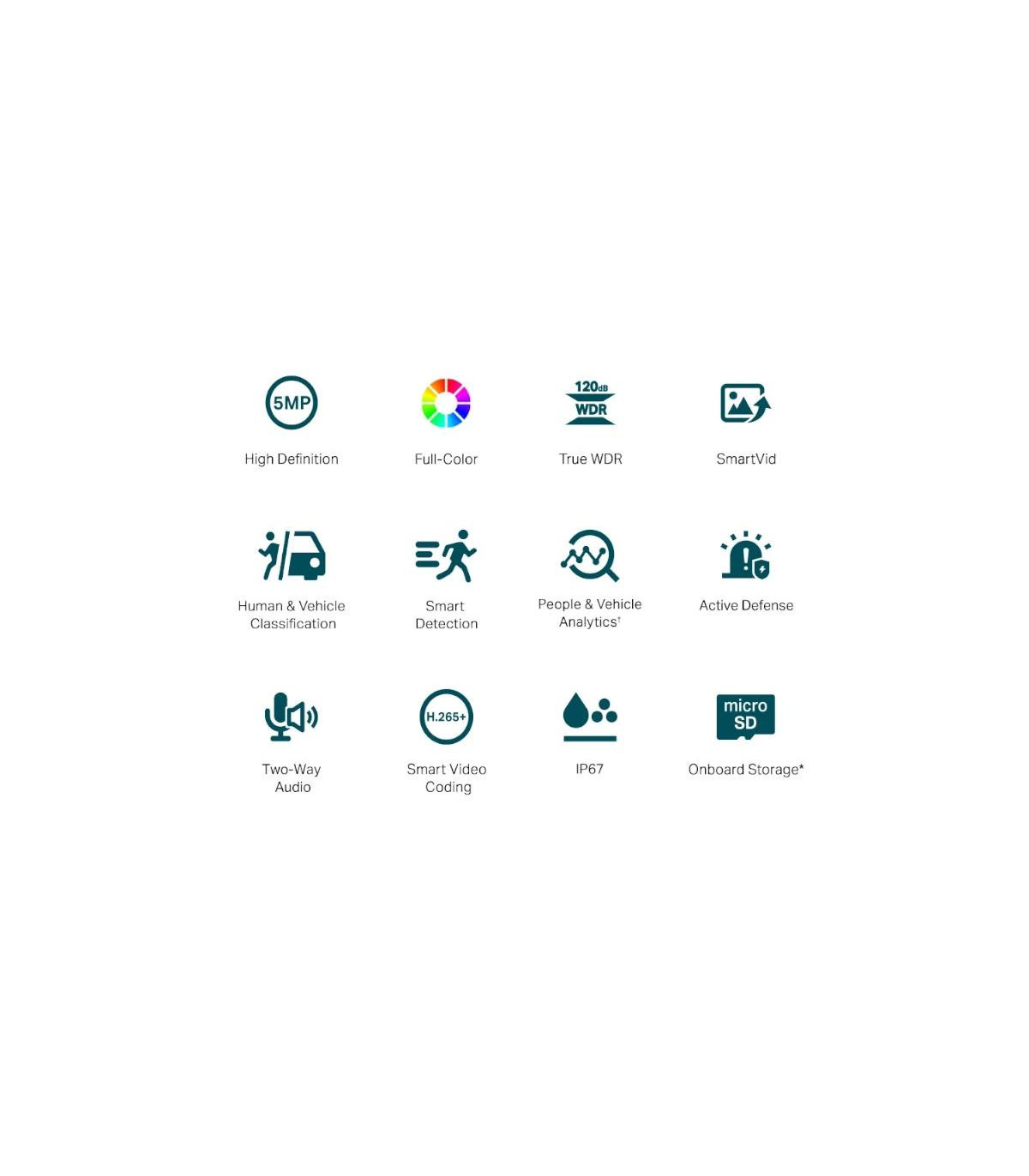 | Características | Red - Protocolo: TCP/IP, UDP, ICMP, HTTP, HTTPS, DHCP, DNS, RTSP, NTP, UPnP UDP, SSL/TLS - ONVIF - API: Open Network Video Interface (Profile S) - Vista en vivo simultánea 3 transmisiones principales y 3 subtransmisiones - Client: VIGI App, VIGI Security Manager, Web UI, VIGI VMS - Navegador web: Google Chrome® 57 and above Firefox® 52 and above Safari® 11 and above Microsoft® Edge 91 and above - Nube - Seguridad: Protección con contraseña, cifrado HTTPS, filtro de dirección IP, autenticación implícita Alarma y Gestión de Eventos - Evento inteligente Clasificación de personas y vehículos Detección de intrusiones Detección de cruce de líneas Región que ingresa a la detección Detección de salida de región Detección de objetos abandonados Detección de eliminación de objetos Detección de merodeo Marco inteligente Detección de personas Detección de vehículos - Evento Básico Detección de movimiento Detección de manipulación de vídeo Excepción (inicio de sesión ilegal) Detección de cambio de escena - Enlace de alarma Grabación de vídeo en tarjeta de memoria Envío de mensajes Advertencia audible Luz blanca intermitente - Notificación de salida: Mensaje push Alimentación - Fuente de alimentación 12V DC ± 5%, Max. 9.7 W, 5.5 mm Coaxial Power Plug PoE: 802.3af/at, class 0, Max. 10.7 W Dimensiones y peso - 74 × 184 × 74 mm - 0.525 Kg Contiene - Cámara de red VIGI - Guía de inicio rápido - Accesorios para cables impermeables - Accesorios de montaje |