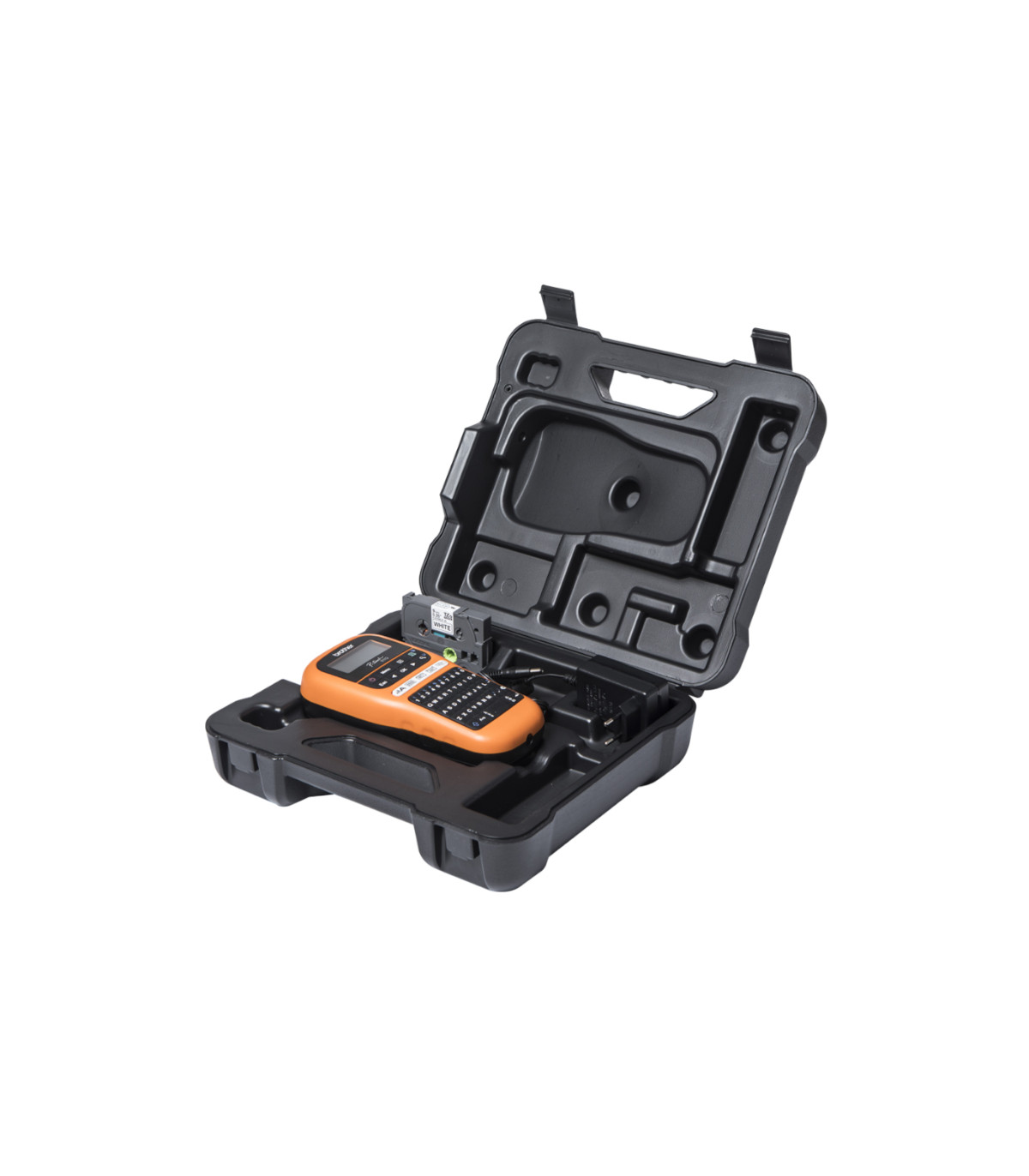IncluyeCinta laminada flexible de identificación negro sobre blanco 9mm x 8m, adaptador de corriente y maletín de transporte.