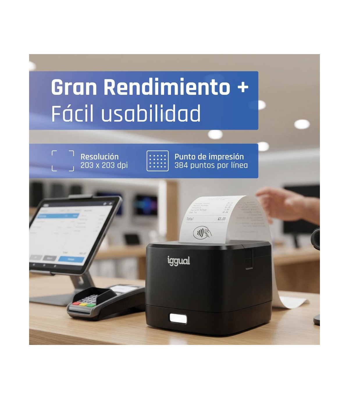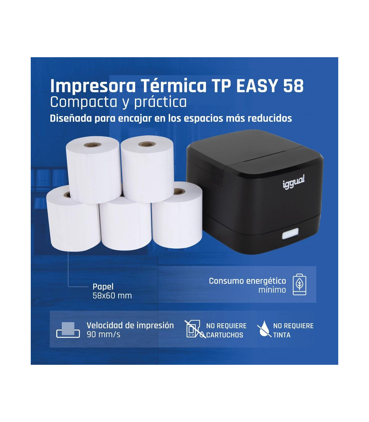 Con una velocidad de impresión de 90 mm/s, una resolución de 203 x 203 dpi y su fácil conexionado mediante puerto USB, la impresora térmica de tickets iggual TP EASY 58 es la solución más sencilla para tu negocio. Gracias a su puerto RJ11 podrás controlar de manera automática la apertura de un cajón portamonedas.