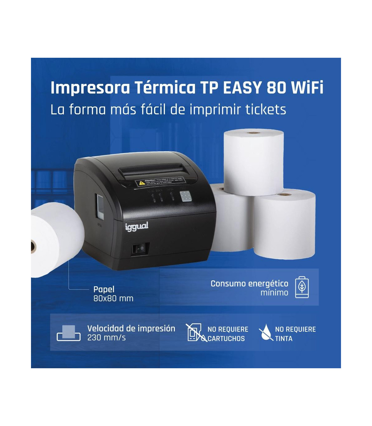 Conecta sin cables y trabaja con total libertad gracias a la impresora térmica TP EASY 80 WiFi de iggual. Diseñada para entornos de venta exigentes, combina conectividad inalámbrica, USB y RJ11, ofreciendo una experiencia ágil, moderna y sin complicaciones. Su impresión rápida y precisa garantiza tickets nítidos incluso en horas punta, todo en un formato compacto que se adapta a cualquier espacio.