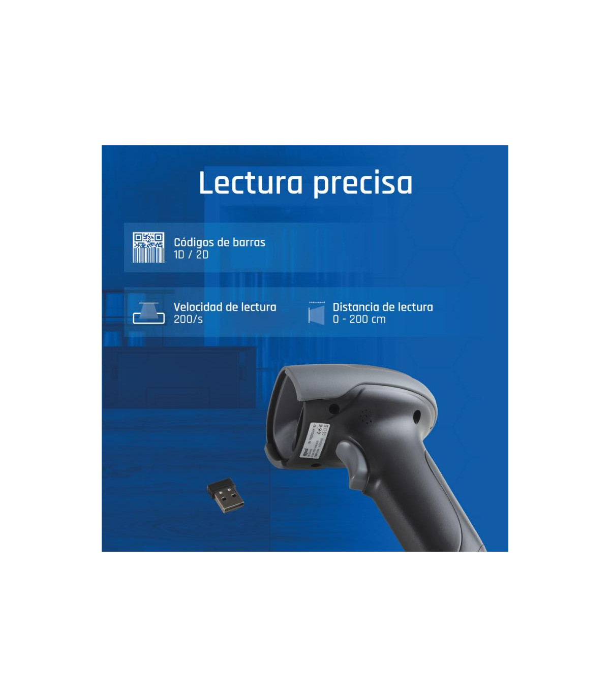 | Características | - Interfaz de conexión: USB, Bluetooth, WiFi 2,4 GHz (dongle USB incluido) - Conector de la base del lector para carga: USB tipo C - Compatibilidad SO: Windows, macOS, Linux y Android - Idiomas soportados: español, portugués, italiano, francés, inglés, alemán, checo, húngaro, japonés, turco... (soporta teclado virtual) - Fuente de luz: banda de luz LED roja (lectura) + luz LED blanca (iluminación) - Densidad del código de barras: ≥4 mil - Tasa de error de bits: 1/5000000 - Tolerancia al movimiento: code128: 20 cm/s, QR: 25 cm/s - Sensor: CMOS plano 640x480 - Modo de lectura: imagen - Modos de activación: escaneo manual mediante disparo con gatillo, escaneo automático en modo continuo, escaneo automático en modo auto detector (auto-sensing) - Distancia de lectura: 1-200 cm - Indicadores: luz LED (visual) y pitido (sonoro) - Contraste de impresión: ≥25% - Ángulos de escaneo: giro 360º, inclinación 37º, rotación 42° - Velocidad de lectura: 200 escaneos por segundo - Alcance máximo de la señal inalámbrica 2,4GHz (libre de obstáculos): ≤90 m - Alcance máximo de la señal inalámbrica Bluetooth (libre de obstáculos): ≤60 m |
