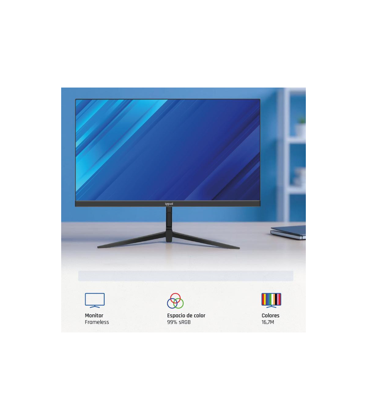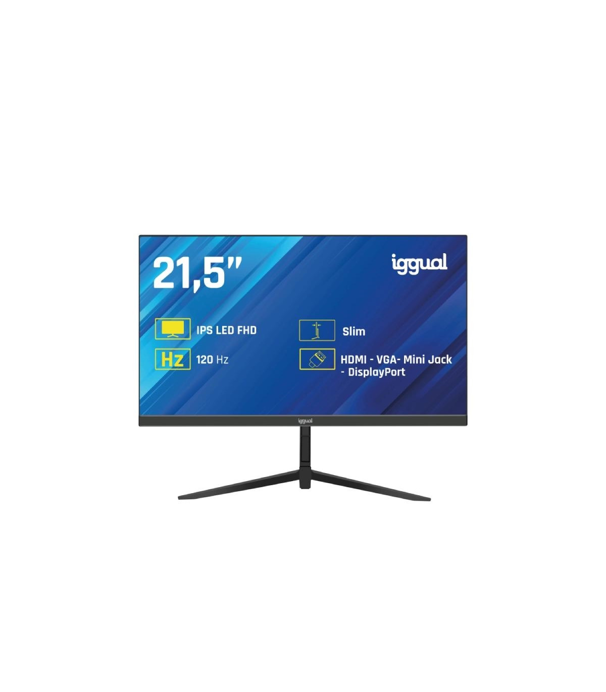 El monitor de 21,5 pulgadas de iggual combina una pantalla IPS Full HD con una tasa de refresco de 120Hz, ofreciendo imágenes claras, colores precisos y una experiencia visual fluida para todo tipo de contenidos: desde ofimática hasta vídeo y diseño.
